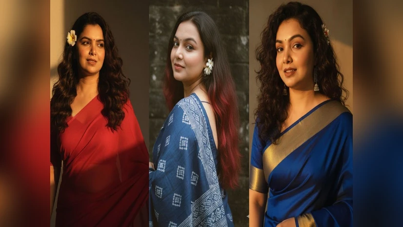 “Create a retro, vintage-inspired image – grainy yet bright. The girl is in a red saree with wavy curls and a flower tucked in her hair. The guy is in a white kurta, holding her waist and gazing into her eyes.”